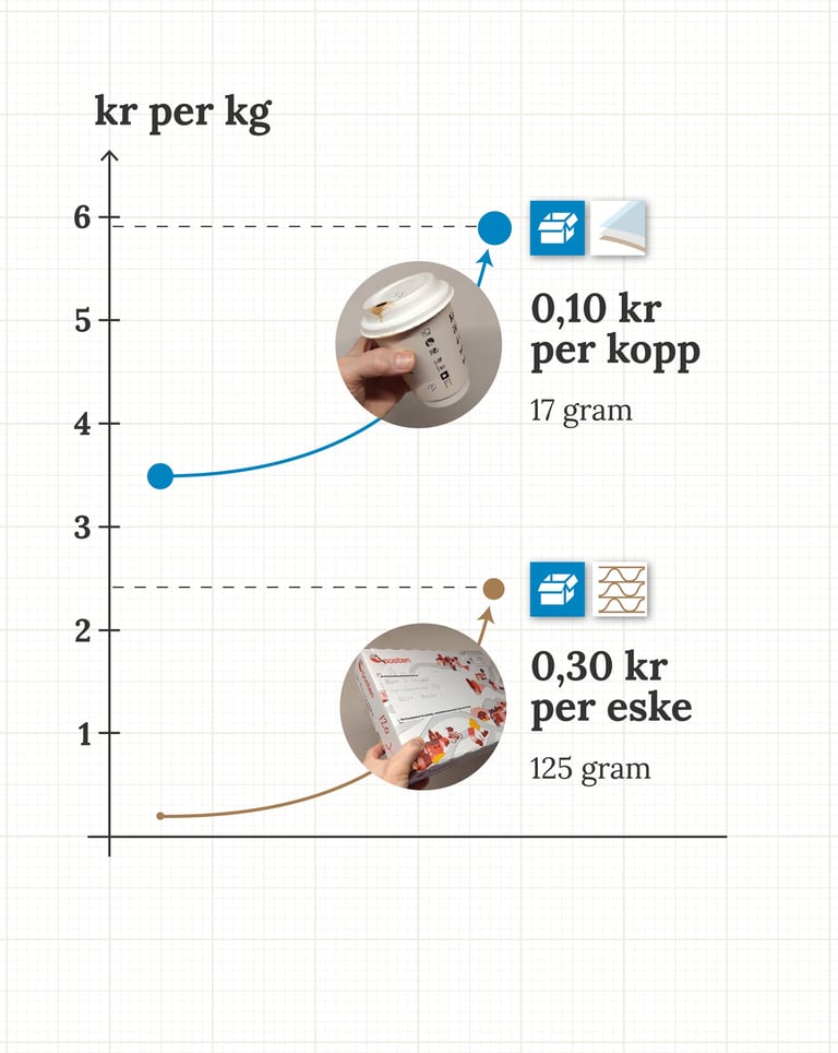 Miljøavgiften på ren kartong er derfor satt til 2,40 kr per kg mens for kartong som har et belegg (<5 % plastbelegg) er dette nå vesentlig høyere: 5,90 kr per kg.